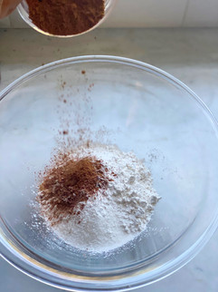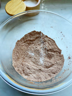 2. In a large bowl, whisk together the flour, sugar, baking powder, cocoa powder, and salt. Set aside.