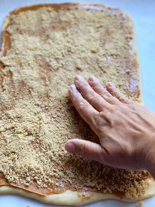 2. Roll the challah dough into a 12x9-inch rectangle and spread evenly with the cookie butter, leaving a ½-inch border. Sprinkle evenly with the brown sugar and press gently into the cookie butter.