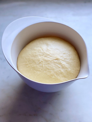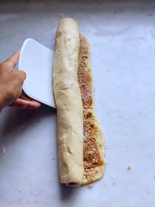 3. Starting from the bottom of the wide end, roll up the dough, using the aid of a dough scraper if necessary. Slice into 8 rolls and place into the lined baking dish, with the seams facing inward.