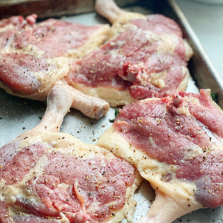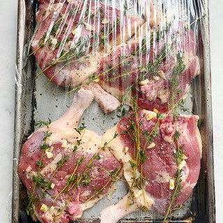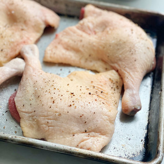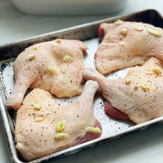 2. Generously salt and pepper the duck legs on both sides, then top with the crushed garlic and thyme on both sides. Cover with plastic wrap and refrigerate for 24 hours along with the reserved bones and fat.