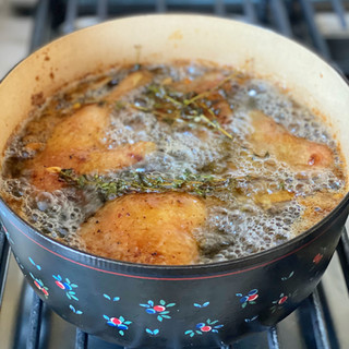 5. Bring the heat to medium or medium-high, and cook the duck legs for two hours uncovered without letting the fat ever boil. Adjust the heat as needed during the cooking process.