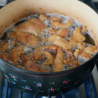 ILOC tip: the fat should never come to a boil but remain quite hot. If the fat more than barely simmers, the meat is put at risk of becoming dry.