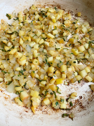 ILOC tip: place the sautéed onion and apple on a sheet pan and spread into a thin layer to facilitate and expedite cooling the mixture before adding it to the turkey.