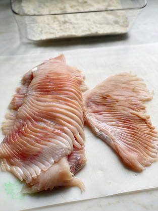 1. First, filet the skate wings if you have purchased them whole. Place the skate wing on a clean, stable work service. Using the tip of a fish or carving knife, make a small cut across the top of the cartilage, separating the flesh from the cartilage. Once you have flesh separated from the cartilage that you can pinch the end, continue to cut the flesh from the cartilage, holding the filleted fish with one hand while you move the knife back and forth across the cartilage with the other hand. The knife's edge should be as parallel to the cartilage as possible, with the knife blade pressing flat against the cartilage below the flesh. Lift the first filet from the cartilage and turn over the wing to repeat the process on the other side. You should be left with a translucent piece of cartilage to discard and four lovely filets to pan fry.