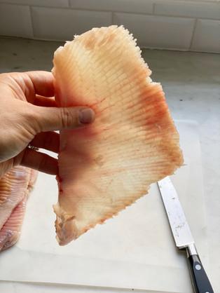 ILOC tip: skate can be cumbersome to turn or remove from the pan, given its length and delicate flesh. The proper tool of a fish spatula is essential to being set up for success. If the filet happens to break into two pieces, do not fret. You will get the chance to hide this minor mishap by plating the fish pieces like a puzzle, one next to the other. It's all about technique, not torture!